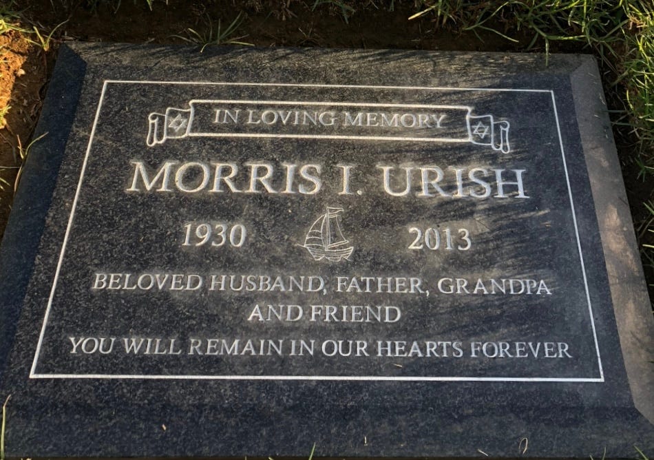 The following day, I was too numb to recall much about the funeral. I imagine Rabbi Thomsky included a few poignant details about Dad’s life, and I guess those in attendance must’ve nodded and smiled through their tears when they were reminded of the kind of man he was: sensitive beneath a facade of armor, generous, occasionally bombastic, loyal, so very, very stubborn, clever …